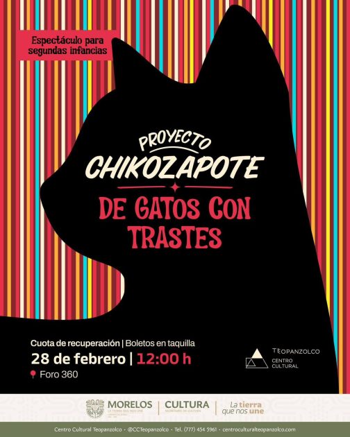 La Secretaría de Cultura de Morelos informó que, como parte del nuevo programa Escena 360 para las infancias, el Centro Cultural Teopanzolco (CCT) presentará la obra de teatro “Gatos con trastes”, el próximo 28 de febrero a las 12:00 horas; la actividad tiene el objetivo de acercar experiencias artísticas sensibles a niñas y niños de tres a seis años, se promueve el juego, la imaginación y la expresión emocional.