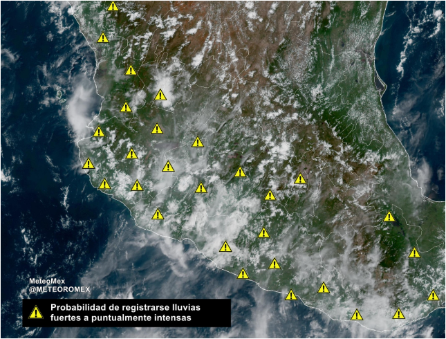 ADVERTENCIA: Esta tarde y noche se pronostican lluvias fuertes a puntualmente intensas desde Sinaloa hasta Chiapas, con posibles turbonadas.