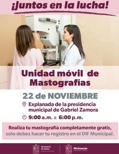 La Lucha contra el cáncer de mama continúa en la entidad, es por ello que la Secretaría de Salud de Michoacán (SSM) anuncia su campaña de mastografías gratuitas en Gabriel Zamora, para mujeres de 40 a 69 años de edad, este próximo martes 22 de noviembre.