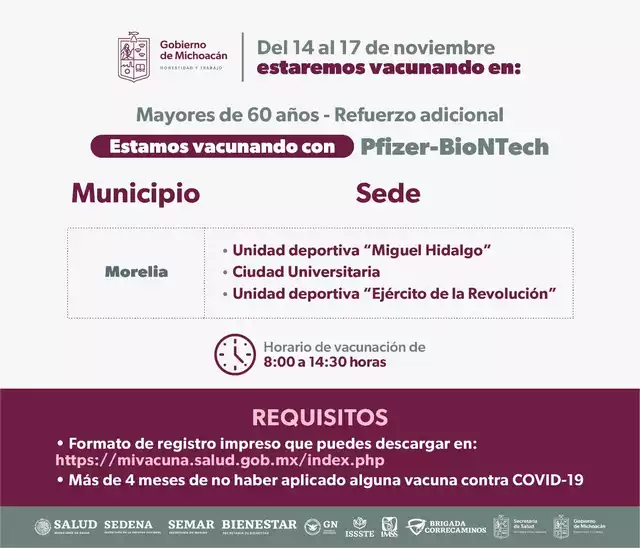La Secretaría de Salud de Michoacán (SSM) informa a la población que del 14 al 17 de noviembre arrancará en Morelia una nueva jornada para aplicar el refuerzo contra el COVID-19 a todos los mayores de 60 años. Para ello se instalarán módulos de vacunación en el Colegio de Morelia “Poliforum”, Ciudad Universitaria, unidad deportiva “Ejército de la Revolución”, mejor conocido como el Venustiano y unidad deportiva “Miguel Hidalgo”.