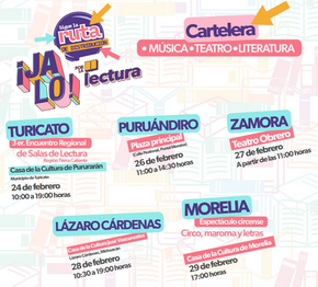 Del 24 al 29 de febrero, las jornadas culturales de Jalo por la Lectura llegarán a plazas públicas de los municipios Turicato, Puruándiro, Zamora, Lázaro Cárdenas y Morelia, con obras de teatro, eventos musicales y dancísticos, y libros recolectados durante el festival donde Los Fabulosos Cadillacs un concierto gratuito.