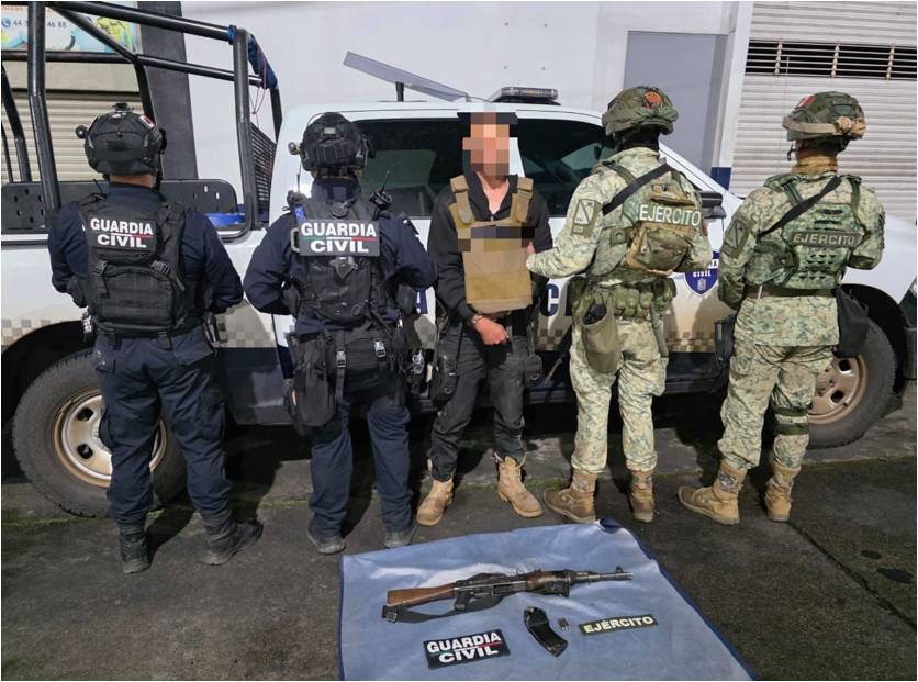 Aunado a ello, en otra acción efectuada en la zona fue detenido un hombre en portación de un arma de fuego calibre 7.62X39 milímetros, cartuchos útiles y un cargador. Por lo anterior, el ahora indiciado y lo asegurado fueron puestos a disposición de la autoridad correspondiente.
