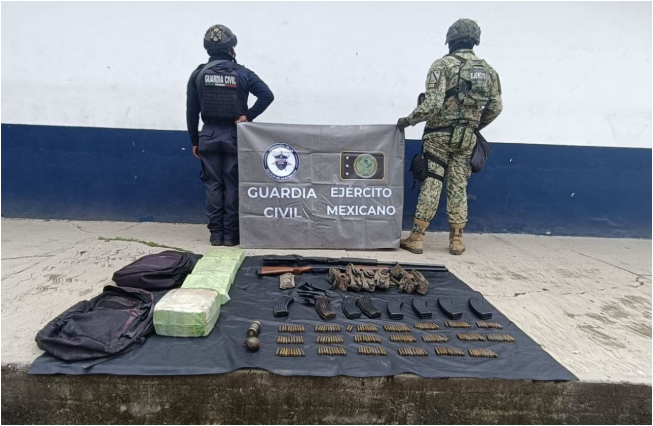 Dentro de los patrullajes coordinados entre la Guardia Civil y el Ejército Mexicano a la altura de la localidad La Eréndira, se realizó el aseguramiento de tres hombres a quienes les decomisaron una granada calibre 40 milímetros y una granada de fragmentación. A los ahora indiciados también se les aseguraron dos escopetas, 2 mil 700 cartuchos útiles y ocho cargadores para calibre 7.62X39 milímetros.