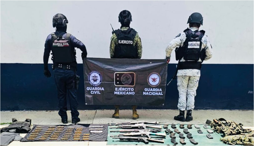 En la localidad de La Ruana de esta demarcación, los efectivos de la Guardia Civil, el Ejército Mexicano y la Guardia Nacional decomisaron cuatro armas de fuego calibre 7.62X39 milímetros y una calibre .223 milímetros, así como 410 cartuchos útiles y 18 cargadores, además de equipo táctico.