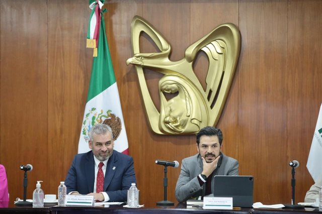 El gobernador Alfredo Ramírez Bedolla y el director general del Instituto Mexicano del Seguro Social (IMSS), Zoé Robledo, encabezaron una reunión de trabajo con el cuerpo directivo para avanzar en el proyecto de descentralización de las oficinas nacionales del Instituto y nuevos hospitales regionales en Michoacán.