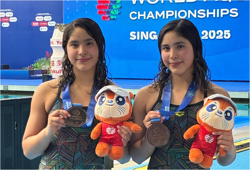 Las gemelas mexicanas Lía y Mía Cueva Lobato hicieron su debut en campeonatos mundiales de mayores, con una medalla de bronce, luego de subir al podio de honor en la competencia femenil de sincronizados trampolín 3 metros, tras sumar 294.36 puntos, en la final que se realizó este martes en el Mundial de Deportes Acuáticos Singapur 2025.