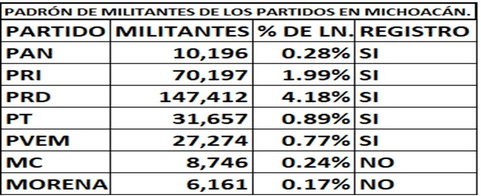 La Ley General de Partidos Políticos establece que bajo ninguna circunstancia los institutos políticos deberán contar con un número total de militantes en el país inferior al 0.26 por ciento del Padrón Electoral Federal que haya sido utilizado en la elección federal inmediata anterior, de manera que, la lista nominal de electores utilizada en la elección del 2021 en Michoacán es de 3 millones, 523 mil, 379 electores, por lo tanto, el 0.26% son 9,160 electores.