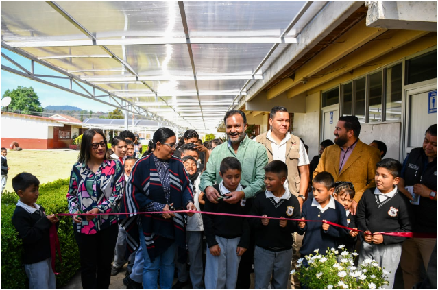 Durante la actividad, autoridades municipales, docentes, madres y padres de familia, así como estudiantes, participaron en el corte de listón del techado de pasillos, una obra que brinda mayor protección, seguridad y mejores condiciones para el desarrollo de las actividades escolares.
