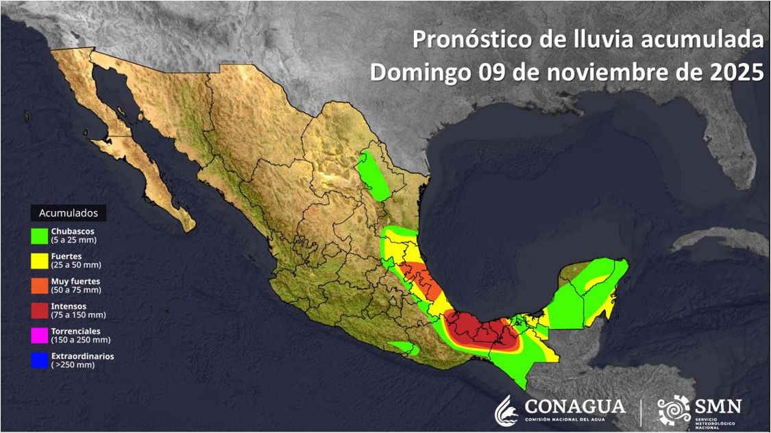 Viento de 40 a 55 km/h con rachas de 70 a 90 km/h en costas de Tamaulipas, Veracruz, Oaxaca y Chiapas (Istmo y golfo de Tehuantepec).