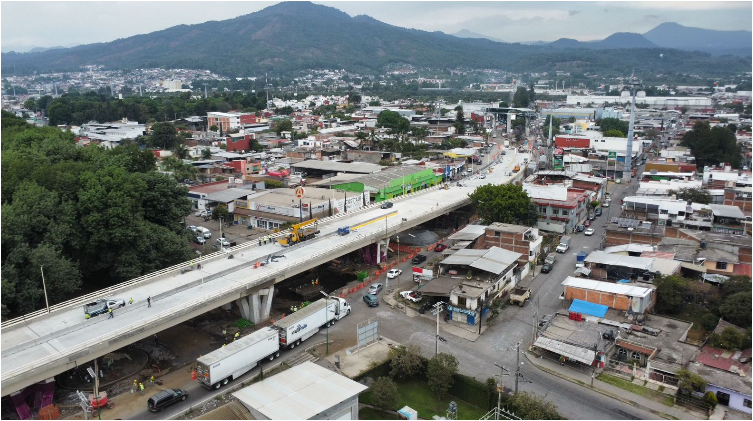 El funcionario estatal detalló que la obra se encuentra en la etapa final, se están concluyendo detalles en el colado de losas de superestructura, colocación de barreras, parapetos y luminarias en las rampas norte y sur, así como trabajos de conformación del skatepark y el bajopuente.