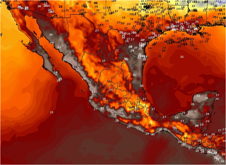 Durante el transcurso de la tarde, se prevén temperaturas templadas con valores de 20 a 25°C en el norte, bajío y centro del país, mientras que en el noroeste, noreste, occidente y sureste oscilarán entre 29 y 35°C.