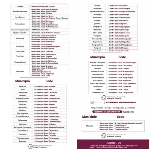 En estas regiones se están inmunizando a población mayor de 18 años con el biológico CanSino en un horario de 8:00 a 14:30 horas, quienes deberán presentarse con formato de registro impreso, el cual podrán descargar a través del link https://mivacuna.gob.mx/index.php.