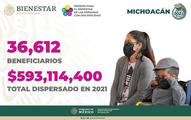 | Morelia, Michoacán.- Por primera vez en la historia de nuestro país se lleva a cabo una política nacional de atención a las personas con discapacidad, con la finalidad de mejorar la calidad de vida del sector. Este año 2021 el Gobierno de México logró beneficiar a más de 36 mil 612 derechohabientes niñas, niñas y jóvenes con alguna discapacidad en Michoacán, quienes de manera bimestral reciben la Pensión para el Bienestar.
