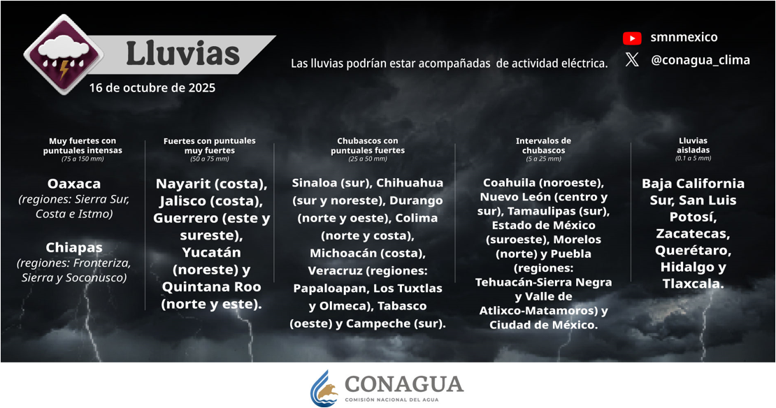 En las próximas horas se prevén lluvias puntuales intensas en Oaxaca y Chiapas