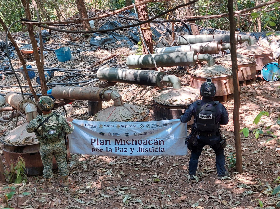 En una acción operativa interinstitucional en el municipio de Arteaga, la Secretaría de Seguridad Pública (SSP) y el Ejército Mexicano desmantelaron un laboratorio clandestino en la localidad de La Placita. En el sitio, presuntamente utilizado para elaborar drogas sintéticas, se aseguraron reactores industriales, contenedores de químicos, tanques de gas y equipo especializado para la producción de narcóticos.