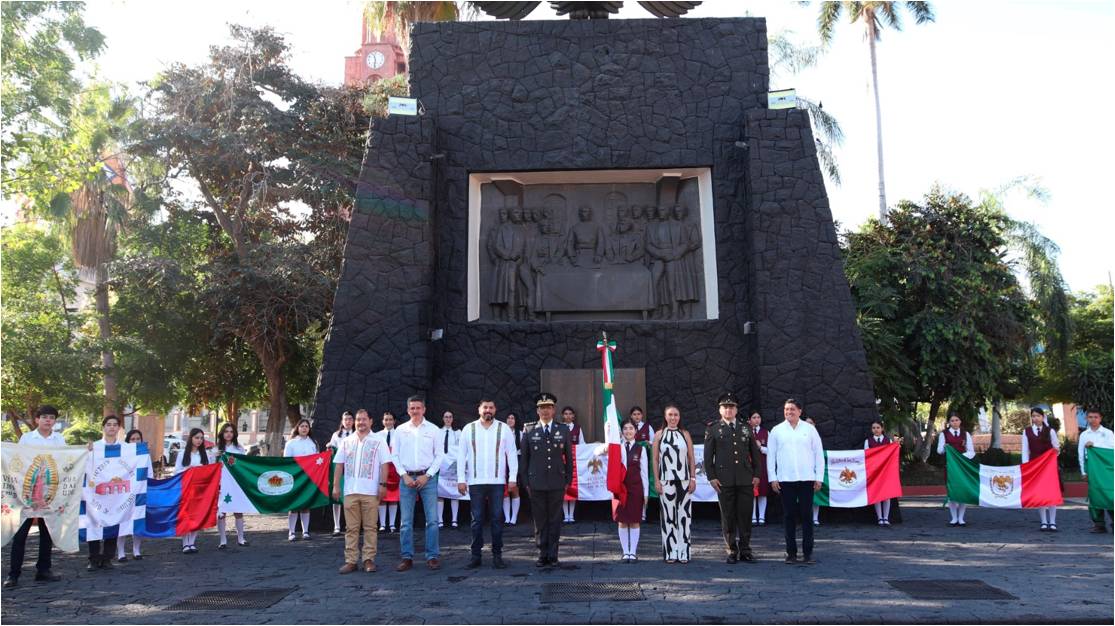 Al acto cívico desarrollado en la Plaza Los Constituyes acudieron funcionarios estatales, municipales, regidores, regidoras e instituciones educativas que encabezaron los honores a la bandera, así como una exhibición de las banderas de México a lo largo de la historia del país.