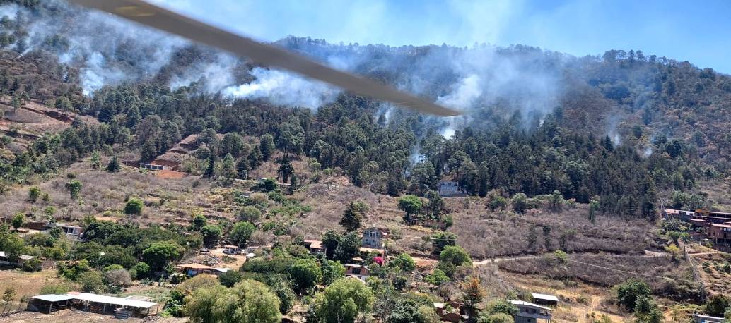 Desde el Centro Estatal del Manejo del Fuego, reportó que la aeronave ha realizado 14 descargas de agua para apagar el incendio, que también se combate por tierra con brigadas de la Cofom, de la Comisión Nacional Forestal (Conafor) y de voluntarios de las comunidades aledañas de Chupio, Tarerio y Ucazanaztacua.