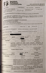 De acuerdo al documento, al momento de la compra del terreno, Patricia Orozco establece como domicilio particular una casa en el fraccionamiento de Bosques Tres Marías, cuyo propietario es Miguel Ángel Aguirre Abellaneda, actual Auditor Superior de Michoacán.