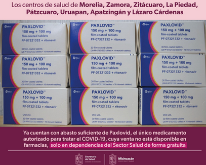 Los centros de salud de Morelia, Zamora, Zitácuaro, La Piedad, Pátzcuaro, Uruapan, Apatzingán y Lázaro Cárdenas, ya cuentan con abasto suficiente de Paxlovid, el único medicamento autorizado para tratar el COVID-19, cuya venta no está disponible en farmacias, solo en dependencias del Sector Salud y es gratuito.
