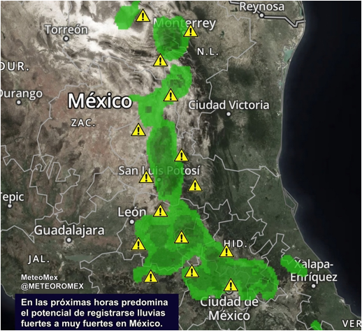 De acuerdo con un reciente análisis meteorológico, en el transcurso de las próximas 6 a 12 horas se pronostican lluvias fuertes a muy fuertes en el norte, bajío y centro del país, debido a canales de baja presión en interacción con la corriente subtropical.