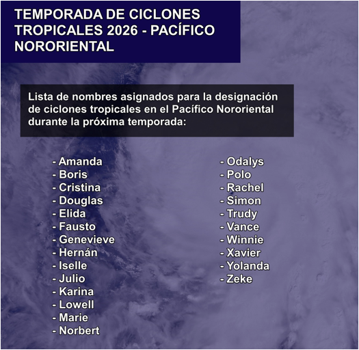 Por el momento, compartimos la lista de nombres asignados para la designación de ciclones tropicales en el Pacífico Nororiental, sin que exista aún una estimación sobre la cantidad de sistemas que podrían desarrollarse.