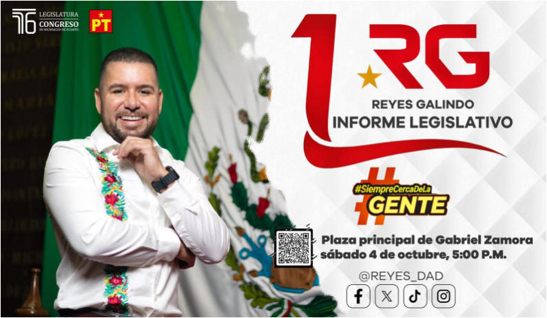 El diputado local por el Distrito 22 de Múgica, Reyes Galindo Pedraza, rendirá su informe legislativo este sábado 4 de octubre a las 5 de la tarde en la localidad de Lombardía, municipio de Gabriel Zamora, esto a fin de atender la obligación de dar cuentas de su trabajo ante el pueblo que lo eligió.