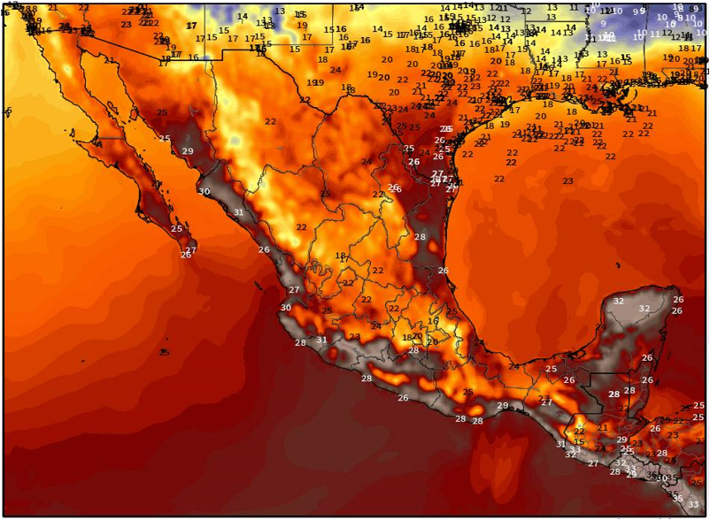 En el transcurso de la tarde, se pronostican temperaturas templadas, con valores de 15 a 20°C en el norte, bajío y centro del país; mientras que en el noreste, occidente, sur y sureste, las temperaturas oscilarán entre los 25 y 35°C.