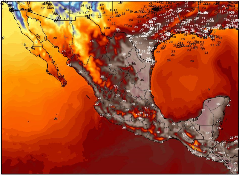 Para la tarde, se estiman temperaturas frías a templadas entre 10 y 20°C en el noroeste y norte del país, debido a la masa de aire marítimo polar. Sin embargo, el calor continuará dominando con intensidad en el noreste, oriente, occidente, bajío, centro, sur y sureste, asociado a la presencia de un anticiclón.