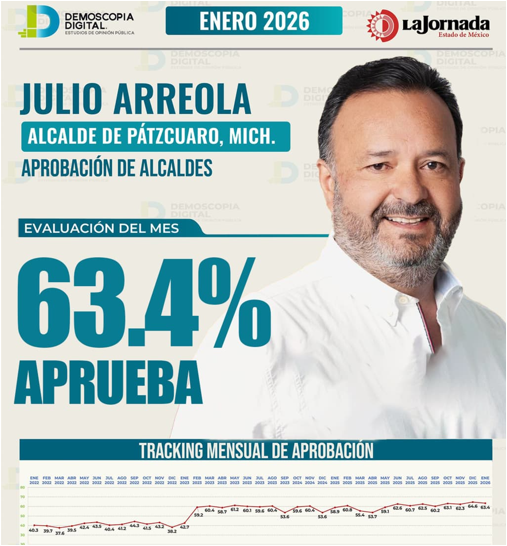 El presidente municipal de Pátzcuaro, Julio Arreola, se posicionó entre los alcaldes mejor evaluados de Michoacán, de acuerdo con el Ranking de Aprobación correspondiente al mes de enero de 2026, elaborado por la casa encuestadora Demoscopía Digital y difundido por La Jornada Estado de México.