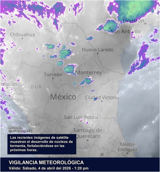 Se mantiene una alerta durante esta tarde, noche y madrugada del 5 de abril en #Coahuila, #NuevoLeón, #Tamaulipas, #SanLuisPotosí, #Querétaro, #Hidalgo, #Edomex y #CDMX, ante el potencial de lluvias fuertes acompañadas de tiempo severo (granizadas y rachas de viento), sin descartar precipitaciones en zonas colindantes.