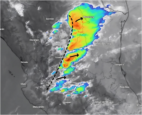Este sistema ha provocado en las últimas horas lluvias moderadas a puntuales fuertes en #Coahuila (sur), #NuevoLeón, #Zacatecas, #Aguascalientes, #SanLuisPotosí, así como en sectores de #Jalisco y #Michoacán (norte).