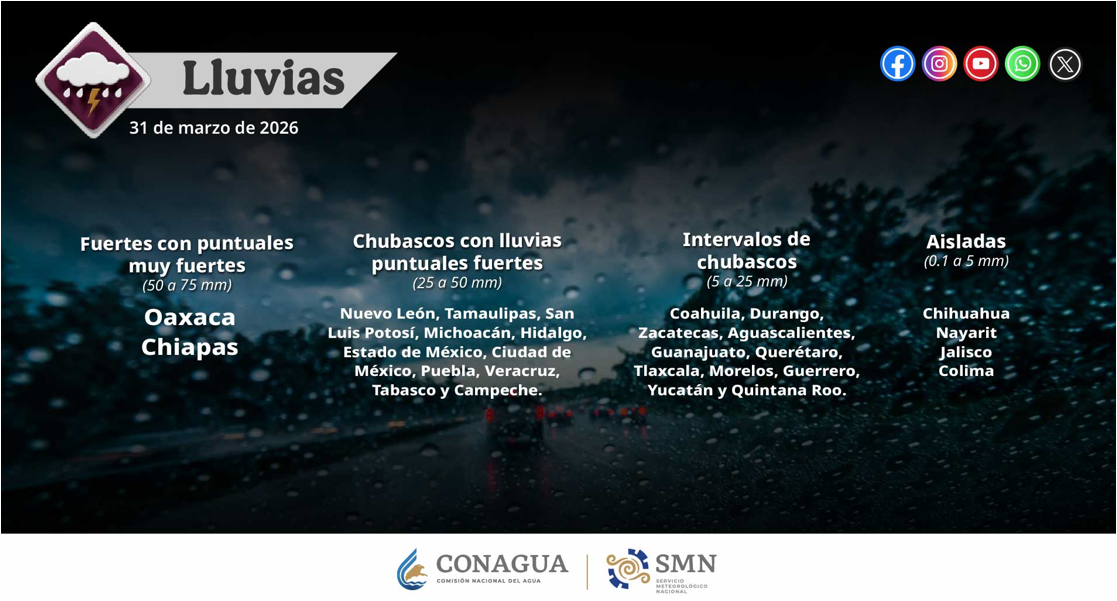 De acuerdo con información de @conagua_clima, para hoy 31 de marzo de 2026 se pronostican: