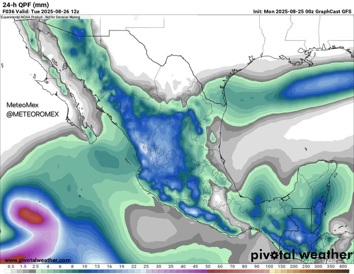 Hoy 25 de agosto, se pronostica el potencial de registrarse precipitaciones en el noroeste, noreste, oriente, occidente, bajío, centro, sur y sureste debido a la interacción entre vaguadas en superficie, el ingreso de humedad del Pacífico y el avance de una onda tropical.