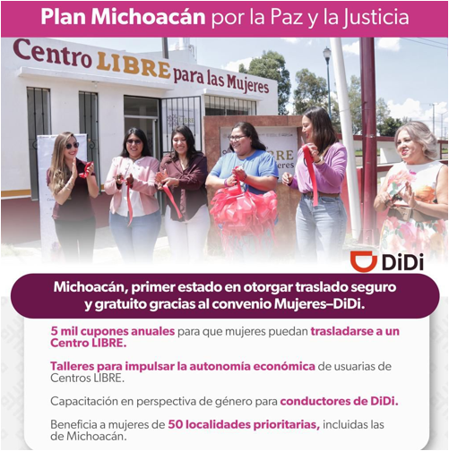 La secretaria de Igualdad Sustantiva y Desarrollo de las Mujeres Michoacanas, Alejandra Anguiano González, informó que gracias al convenio firmado a nivel nacional entre la Secretaría de las Mujeres del Gobierno de México y la plataforma DiDi, Michoacán se convirtió en el primer estado del país en otorgar un traslado seguro a una usuaria que requería acudir a un espacio de atención y regresar a su hogar sin riesgo, mediante los cupones de movilidad para mujeres que requieren acompañamiento seguro.