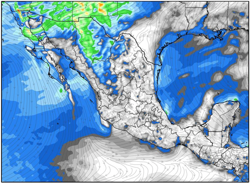 Las lluvias se concentrarán especialmente en el estado de #BajaCalifornia (zona norte) debido al desplazamiento de este sistema en interacción con la corriente en chorro subtropical. En el resto del país no se prevé probabilidad de lluvia.