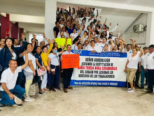 Protestando todos los agremiados por el actuar de la titular de la Institución, bajo el eslogan “Fuera Teresa Mora Covarrubias del COBAEM”, por su trato represivo hacia los trabajadores del SITCBEM, ante la exigencia de que se cumpla con el pago de prestaciones para trabajadores activos y jubilados, quien además violenta los derechos consagrados en las Condiciones Generales de Trabajo, por el mal manejo de la institucional y por el cese ilegal de agremiados.