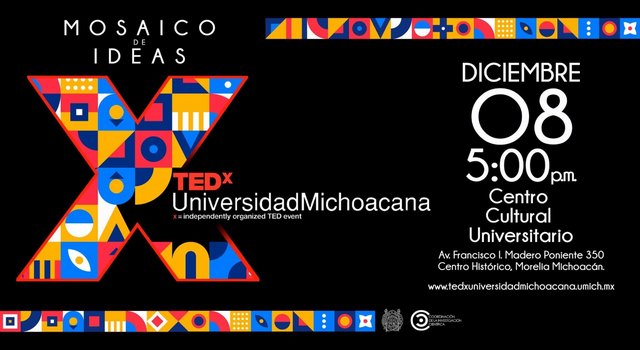 TEDx Universidad Michoacana tendrá lugar en el Centro Cultural Universitario, este jueves 8 de diciembre a partir de las 17:00 horas, los interesados en asistir podrán solicitar sus pases en las oficinas de la Coordinación de la Investigación Científica, ubicada en el edificio C2 de Ciudad Universitaria, los días lunes y martes de diez de la mañana a tres de la tarde; para más información consultar el sitio oficial https://tedxuniversidadmichoacana.umich.mx/oradores/edicion-2022.html