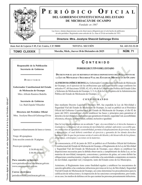 El secretario de Gobierno, Raúl Zepeda Villaseñor, informó la publicación en el Periódico Oficial del Estado del decreto que reforma el Reglamento de la Ley de Movilidad y Seguridad Vial y elimina las multas e infracciones económicas de tránsito en Michoacán.