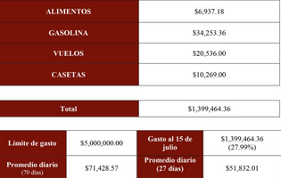 En transporte se han ocupado, 88 mil 338.72 pesos; en hospedaje, 23 mil 689.33; el rubro de alimentos registró seis mil 937.18; para gasolina 34 mil 253.36 pesos; 20 mil 536 pesos en vuelos, mientras que en el pago de casetas se ocuparon 10 mil 269 pesos.