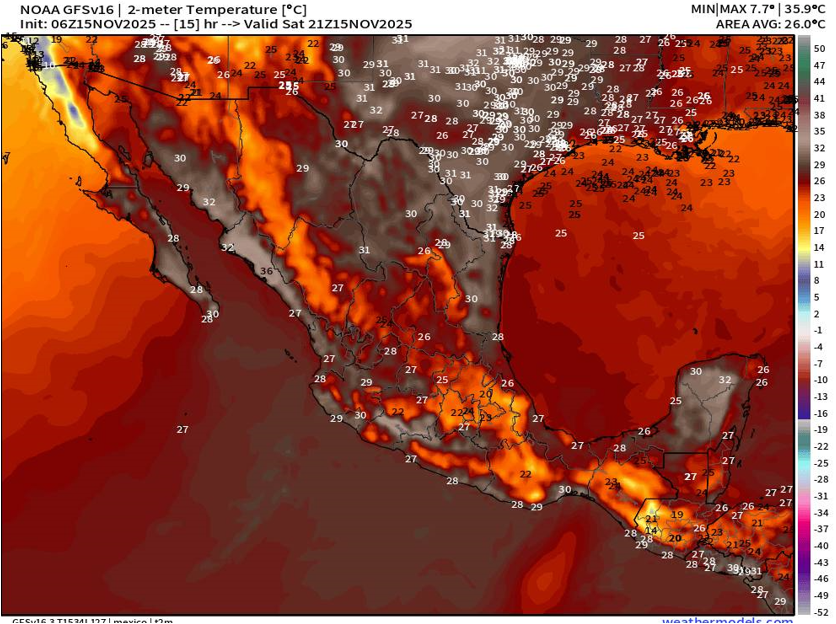 Durante la tarde, se pronostican temperaturas frescas de 10 a 15°C en el extremo norte de Baja California. En contraste, en el resto del noroeste, norte, noreste, oriente, occidente y sureste, los valores oscilarán entre 29 y 35°C.