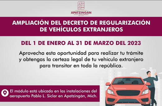 Apatzingán, Mich.- Por instrucciones del gobierno de Andrés Manuel López Obrador se extiende el plazo de Enero a Marzo 2023 para la legalización de autos de procedencia extranjera, conocidos como “chocolates”, por lo que en Apatzingán el módulo regional ubicado en el Aeropuerto Pablo L. Sidar sigue realizando el trámite para dar legalidad a los propietarios de autos con placas americanas.