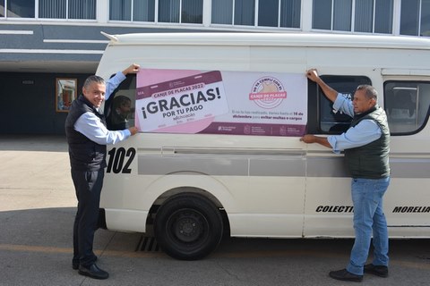 La Secretaría de Finanzas y Administración (SFA) del Gobierno de Michoacán, en coordinación con diferentes rutas del transporte público, inició el pegado de calcomanías en camionetas y vehículos de pasajeros, con el reconocimiento a los ciudadanos que ya cumplieron con el trámite y el pago de refrendos y placas de circulación, y la invitación de hacerlo a aquellos ciudadanos que, por diferentes motivos, no han acudido a los módulos o a las ventanillas recaudadoras.