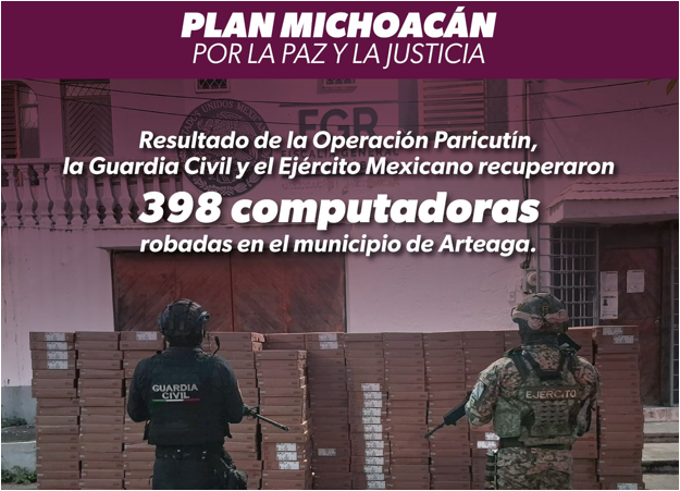 La Operación Paricutín permitió efectuar una labor interinstitucional coordinada entre las secretarías de Seguridad Pública (SSP) y de la Defensa Nacional (Defensa), en la cual se recuperaron 398 computadoras nuevas que habían sido robadas en el municipio de Arteaga.