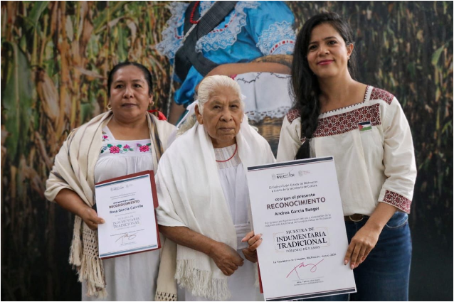 El gobernador Alfredo Ramírez entregó un reconocimiento a la portadora Andrea García Rangel por su labor en la preservación y continuidad de la indumentaria tradicional de la región nahua. También fue reconocida por el mismo concepto María Chaves Rodríguez, originaria de San Juan de las Colchas, comunidad que quedó sepultada tras la erupción del volcán Paricutín.