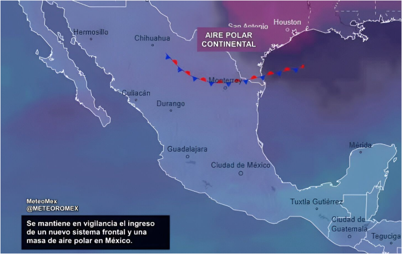 La masa de aire que impulsa este sistema reforzaría el ambiente frío en gran parte del territorio nacional, sin descartarse lluvias y rachas de viento conforme se desplace por la vertiente del Golfo de México.